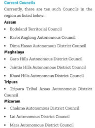 – The North Cachar Hill autonomous council, Dima Hasao, Karbi Anglong autonomous council, East Karbi Anglong are autonomous council constitute under the provision of six schedule of the